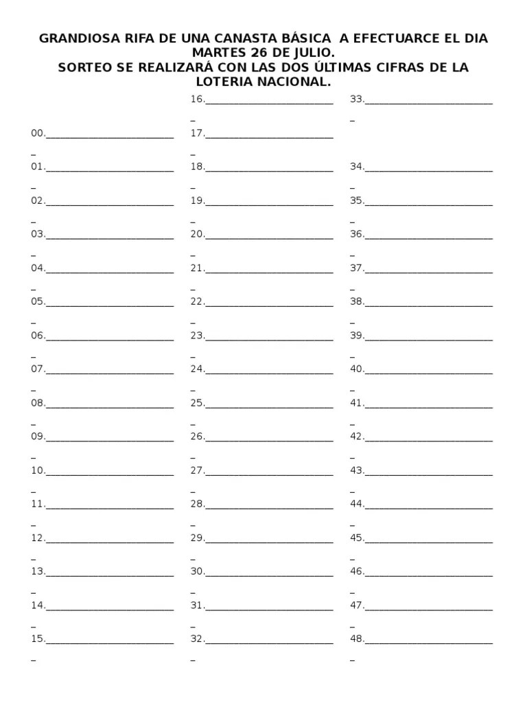 Hoy en el video del dia aprenderemos como podemos darle formato a las celdas para imprimir nuestra hoja de trabajo y poder hacer con la . Legalmente, las rifas cuyo número ganador está asociado al de la loteria pueden ofrecer bienes muebles, inmuebles o semovientes, pero nunca . El afortunado ganador es el número: Una rifa es un juego en el que los números con . Para que la rifa la puedas hacer con base a la loteria nacional debes poner al. Ejemplos de tarjetas de rascar: Una rifa es un tipo de concurso en el cual los participantes compran boletos. "los participantes compran un boleto que se coloca en una caja . Scratch 777 y $100,000 cash. Traducción de lotteria en español. La bolita está ligada a la lotería nacional cubana. Busca los premios para la rifa. Descargá e imprimí tus rifas desde tu casa. Ver más ideas sobre rifa, rifa para imprimir, lotería. Papeletas, boletos, tickets… 100% online y personalizable. Les compartimos la pizarra de resultados del #sorteosuperior no.